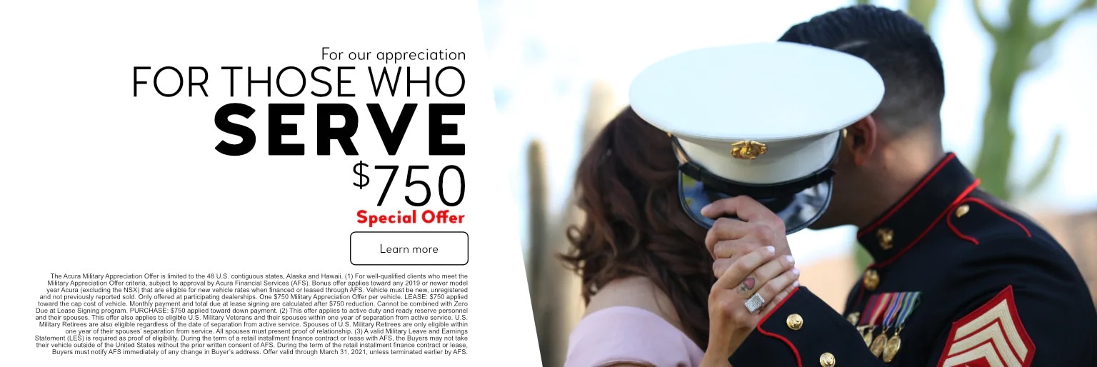 The Acura Military Appreciation Offer salutes your military service by offering you a savings of $750 towards any new 2020 or newer Acura vehicle when you finance or lease with Acura Financial Services®