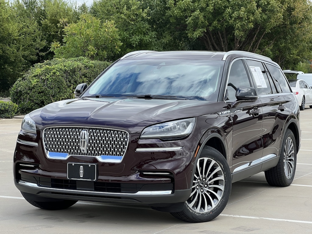 Diamond Red Metallic Tinted Clearcoat 2023 Lincoln Aviator Reserve AWD 10-Speed Automatic 3.0L V6 Aviator Reserve, 4D Sport Utility, 3.0L V6, 10-Speed Automatic, AWD, Diamond Red Metallic Tinted Clearcoat, Ebony Leather, 14 Speakers, 3.58 Axle Ratio, 30-Way Perfect Position Seats w/Active Motion, 3rd row seats: split-bench, 4-Wheel Disc Brakes, ABS brakes, Active Park Assist 2.0, Adaptive suspension, Air Conditioning, All-Weather 1st & 2nd Row Floor Liners (16A), Alloy wheels, AM/FM radio: SiriusXM, Audio memory, Auto Air Refresh, Auto Heated/Ventilated Driver & Passenger Seats, Auto High-beam Headlights, Auto-dimming door mirrors, Auto-dimming Rear-View mirror, Automatic temperature control, Brake assist, Bumpers: body-color, Compass, Delay-off headlights, Driver door bin, Driver vanity mirror, Dual front impact airbags, Dual front side impact airbags, Electronic Stability Control, Elements Package Plus, Emergency communication system, Equipment Group 201A, Evasive Steering Assist, Four wheel independent suspension, Front anti-roll bar, Front Bucket Seats, Front Center Armrest, Front dual zone A/C, Front reading lights, Fully automatic headlights, Garage door transmitter, Hands-Free Liftgate Delete, Head-Up Display, Heated door mirrors, Heated front seats, Heated Steering Wheel, Heated VisioBlade Wipers, Heated/Ventilated 2nd Row Outboard Seats, HVAC memory, Illuminated entry, Intelligent Adaptive Cruise Control, Knee airbag, Leather steering wheel, Lincoln Co-Pilot360 1.5 Plus, Low tire pressure warning, Luxury Package, Memory seat, Navigation System, Occupant sensing airbag, Outside temperature display, Overhead airbag, Overhead console, Panic alarm, Passenger door bin, Passenger vanity mirror, Phone As A Key, Power door mirrors, Power driver seat, Power Liftgate, Power moonroof: Panoramic Vista Roof, Power passenger seat, Power steering, Power windows, Premium Lthr Heated/Ventilated Fnt Captain's Chairs, Radio data system, Radio: Revel AM/FM Audio System w/14 Speakers, Radio: Revel Ultima 3D Audio System w/28 Speakers, Rain sensing wipers, Rear air conditioning, Rear anti-roll bar, Rear audio controls, Rear Door Sunshades, Rear dual zone A/C, Rear reading lights, Rear window defroster, Rear window wiper, Remote keyless entry, Reverse Brake Assist, Security system, SiriusXM Radio, Speed control, Speed-Sensitive Wipers, Split folding rear seat, Spoiler, Steering wheel memory, Steering wheel mounted A/C controls, Steering wheel mounted audio controls, SYNC 3 Communication & Entertainment System, Tachometer, Telescoping steering wheel, Tilt steering wheel, Traction control, Trip computer, Turn signal indicator mirrors, Variably intermittent wipers, Wheels: 20 Bright-Machined Aluminum.
