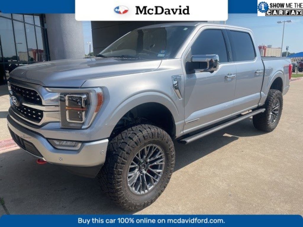 CARFAX One-Owner. Iconic Silver Metallic 2023 Ford F-150 Platinum 4WD 10-Speed Automatic 3.5L PowerBoost Full-Hybrid V6 BLUETOOTH, REAR BACK UP CAMERA, APPLE CAR PLAY, 3.5L PowerBoost Full-Hybrid V6, 4WD, 360 Degree Camera, 4x4 FX4 Off-Road Bodyside Decal, 8 Speakers, Adjustable pedals, Alloy wheels, Auto tilt-away steering wheel, Auto-dimming door mirrors, Auto-dimming Rear-View mirror, Bed Utility Package, BoxLink, Compass, Electronic Locking w/3.31 Axle Ratio, Emergency communication system: SYNC 4 911 Assist, Equipment Group 701A High, Ford BlueCruise 1.0, Front dual zone A/C, Front fog lights, Fully automatic headlights, FX4 Off-Road Package, Garage door transmitter, Heated front seats, Heated rear seats, Heated steering wheel, Hill Descent Control, LED Box Lighting, Low tire pressure warning, Memory seat, Monotube Rear Shocks, Navigation system: Connected Navigation, Off-Road Tuned Front Shock Absorbers, Outside temperature display, Pedal memory, Power door mirrors, Power driver seat, Power steering, Power Tailgate, Power windows, Pro Power Onboard - 7.2KW, Pro Trailer Backup Assist & Pro Trailer Hitch Assist, Radio: B&O Unleashed Sound System by Bang & Olufsen, Rain sensing wipers, Rock Crawl Mode, Speed-sensing steering, Steering wheel memory, SYNC 4 w/Enhanced Voice Recognition, Tailgate Step w/Tailgate Work Surface, Telescoping steering wheel, Tilt steering wheel, Tray Style Floor Liner, Turn signal indicator mirrors, Twin Panel Moonroof, Ventilated front seats.Recent Arrival!