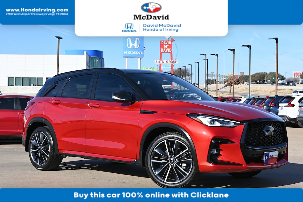 This 2023 QX50 has a very popular Dynamic Sunstone Red exterior color with Monaco Red that looks fantastic! Bluetooth Heated Front Seats Keyless Entry Remote Start Backup Camera Navigation Sunroof/ Moonroof PRICED TO SELL QUICKLY! Research suggests it will not be available for long. -Carfax One Owner- -Low Mileage- This Dynamic Sunstone Red 2023 INFINITI QX50 SPORT is priced to sell fast! Please visit our website to view the complete Value Report, Vehicle History Report and to learn more about this QX50 at https://www.mcdavidhondairving.com/ . David McDavid Honda of Irving prides itself on value pricing its vehicles and exceeding all customer expectations! The next step? Give us a call to confirm availability and schedule a hassle free test drive (469) 405-3340! We are located at: 3700 W Airport Fwy, Irving, TX 75062. For more than 70 years, David McDavid Honda of Irving has been serving the automotive needs of drivers throughout the Dallas Fort Worth Metroplex. We stock a large selection of new and used Honda cars at great prices. If you need assistance with choosing a new car, obtaining financing, or have service and repair questions, our friendly and knowledgeable staff will get your questions answered. Our dealership is located in Irving, but we proudly serve the Dallas, Fort Worth, Arlington, and Grand Prairie, and DFW area.