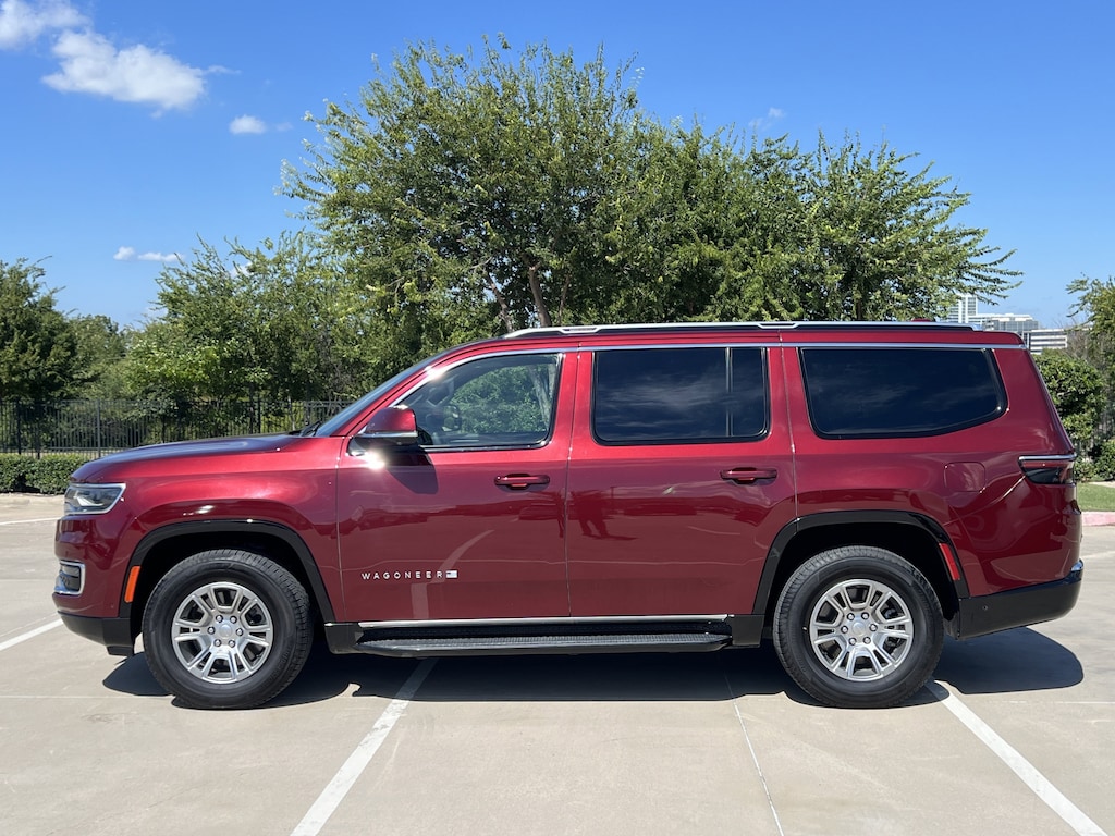 CARFAX One-Owner. Velvet Red Pearlcoat 2022 Jeep Wagoneer Series I 4WD 8-Speed Automatic 5.7L V8 Wagoneer Series I, 4D Sport Utility, 5.7L V8, 8-Speed Automatic, 4WD, Velvet Red Pearlcoat, Black Leather, 10 Speakers, 2nd Row Manual Window Shades, 3.21 Rear Axle Ratio, 3rd row seats: bench, 4-Wheel Disc Brakes, ABS brakes, Active Lane Management System, Adaptive Cruise Control w/Stop & Go, Adjustable pedals, Air Conditioning, Alloy wheels, AM/FM radio: SiriusXM with 360L, Anti-whiplash front head restraints, Audio memory, Auto High Beam Headlamp Control, Auto-dimming door mirrors, Auto-dimming Rear-View mirror, Auto-leveling suspension, Automatic temperature control, Brake assist, Bumpers: body-color, Compass, Convenience Group I, Delay-off headlights, Driver door bin, Driver vanity mirror, Driver's Seat Mounted Armrest, Dual front impact airbags, Dual front side impact airbags, Electronic Stability Control, Exterior Parking Camera Rear, Four wheel independent suspension, Front anti-roll bar, Front Bucket Seats, Front Center Armrest w/Storage, Front dual zone A/C, Front fog lights, Front Passenger Interactive Display, Front reading lights, Fully automatic headlights, Garage door transmitter, Heated door mirrors, Heated front seats, Heated Second Row Seats, Heated steering wheel, Illuminated entry, Knee airbag, Leather Trimmed Bucket Seats, Low tire pressure warning, Memory seat, Memory Steering Column, Navigation System, Normal Duty Suspension, Occupant sensing airbag, Outside temperature display, Overhead airbag, Overhead console, P&P Park & Unpark Assist w/Stop System, Panic alarm, Passenger door bin, Passenger seat mounted armrest, Passenger vanity mirror, Pedal memory, Power adjustable front head restraints, Power door mirrors, Power driver seat, Power Liftgate, Power passenger seat, Power steering, Power windows, Quick Order Package 22E, Radio data system, Radio: Uconnect 5 Nav w/10.1 Display, Rain Sensitive Windshield Wipers, Rear air conditioning, Rear anti-roll bar, Rear dual zone A/C, Rear reading lights, Rear seat center armrest, Rear window defroster, Rear window wiper, Reclining 3rd row seat, Remote keyless entry, Security system, Speed control, Speed-sensing steering, Speed-Sensitive Wipers, Split folding rear seat, Steering wheel memory, Steering wheel mounted audio controls, Surround View Camera System, Tachometer, Telescoping steering wheel, Tilt steering wheel, Traction control, Trip computer, Turn signal indicator mirrors, Variably intermittent wipers, Ventilated front seats, Voltmeter, Wheels: 18 x 8.0 Aluminum Base Finish, Wireless Charging Pad.