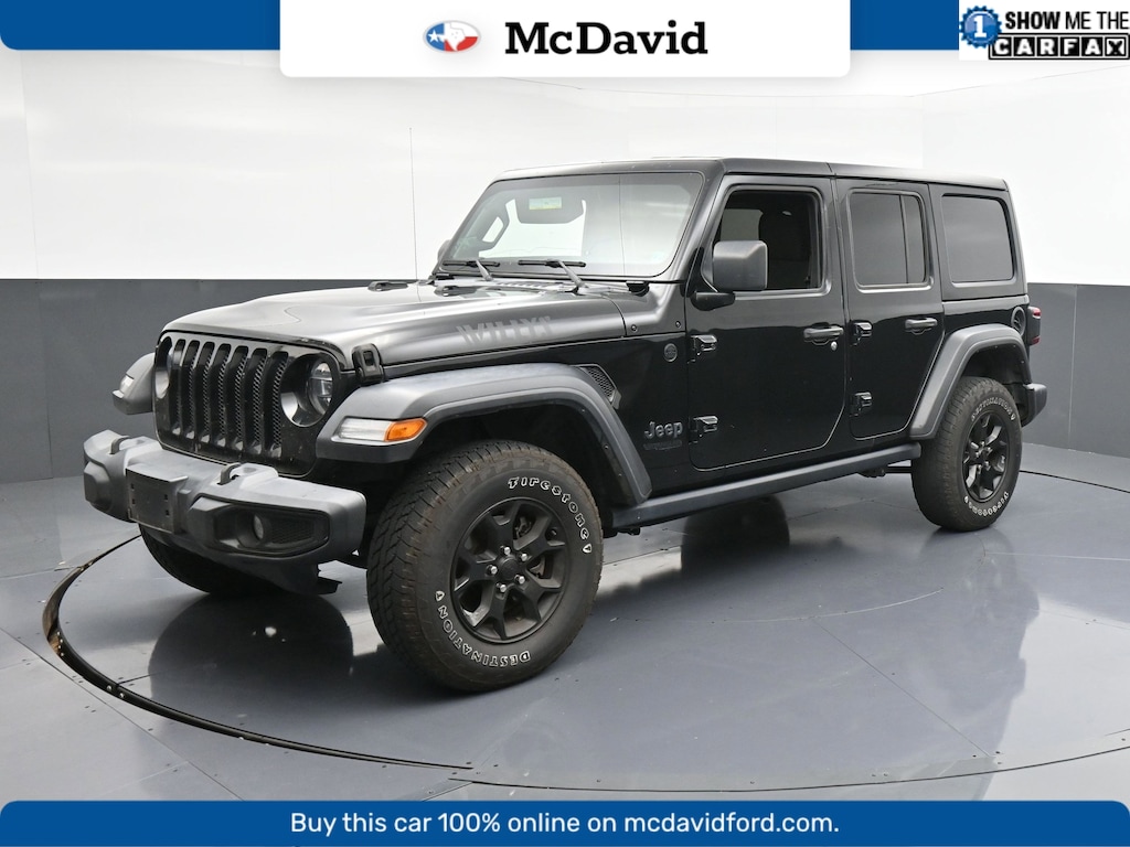 CARFAX One-Owner. Clean CARFAX. Black Clearcoat 2022 Jeep Wrangler Unlimited Willys 4WD 8-Speed Automatic 3.6L V6 24V VVT 4-Wheel Drive Swing Gate Decal, 97 MPH Vehicle Max Speed Calibration, Anti-Spin Differential Rear Axle, Automatic Headlamps, Black Grille, Black Trail Rated Badge, Blind Spot & Cross Path Detection, Deep Tint Sunscreen Windows, Front 1-Touch Down Power Windows, Front LED Fog Lamps, Injection Molded Black Rear Bumper, Leather Wrapped Steering Wheel, LED Headlamp & Fog Lamp Group, LED Premium Reflector Headlamps, LED Taillamps, Matte Black Jeep Badge, Mold In Color Bumper w/Gloss Black, MOPAR All-Weather Floor Mats, ParkSense Rear Park Assist System, Power Heated Mirrors, Quick Order Package 24W Willys, Remote Keyless Entry, Safety Group, Security Alarm, Speed Sensitive Power Locks, Sun Visors w/Illuminated Vanity Mirrors, Wheels: 17 x 7.5 Moab Black Aluminum, Willys, Willys Hood Decal.