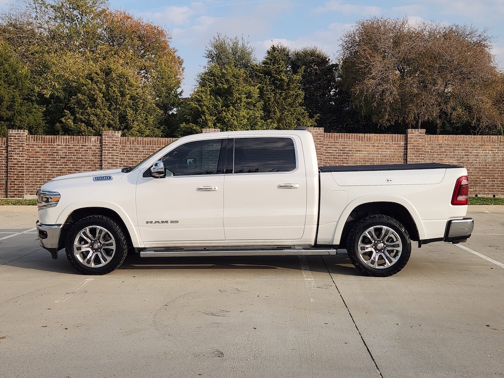 CARFAX One-Owner. Clean CARFAX. Ivory White Tri-Coat Pearlcoat 2021 Ram 1500 Laramie Longhorn 4WD 8-Speed Automatic HEMI 5.7L V8 Multi Displacement VVT ONE OWNER, CLEAN CARFAX, #1 Seat Foam Cushion, 1-Yr SiriusXM Guardian Trial, 10 Speakers, 3 Rear Seat Head Restraints, 33 Gallon Fuel Tank, 4 Way Front Headrests, 4-Wheel Disc Brakes, 48V Belt Starter Generator, 4G LTE Wi-Fi Hot Spot, 5-Year SiriusXM Travel Link Service, 8.4 Touchscreen Display, ABS brakes, Adjustable pedals, Air Conditioning, Alloy wheels, AM/FM radio: SiriusXM, Anti-Spin Differential Rear Axle, Apple CarPlay, Apple CarPlay/Android Auto, Audio memory, Auto High-beam Headlights, Auto-dimming door mirrors, Auto-dimming Rear-View mirror, Automatic temperature control, Bed Utility Group, Brake assist, Bucket Seats, Bumpers: chrome, Chrome Exterior Mirrors, Compass, Delay-off headlights, Disassociated Touchscreen Display, Driver door bin, Driver Seat Memory, Driver vanity mirror, Dual front impact airbags, Dual front side impact airbags, Electronic Stability Control, Emergency communication system: SiriusXM Guardian, Exterior 115V AC Outlet, For Details, Visit DriveUconnect.com, For More Info, Call 800-643-2112, Front anti-roll bar, Front Bucket Seats, Front Center Armrest w/Storage, Front dual zone A/C, Front fog lights, Front License Plate Bracket, Front reading lights, Front Seat Back Map Pockets, Front wheel independent suspension, Fully automatic headlights, Garage door transmitter, Genuine wood console insert, Genuine wood dashboard insert, Genuine wood door panel insert, Google Android Auto, GPS Antenna Input, GPS Navigation, HD Radio, Heated door mirrors, Heated Front Seats, Heated front seats, Heated rear seats, Heated Second Row Seats, Heated Steering Wheel, Heated steering wheel, Illuminated entry, Integrated Center Stack Radio, Integrated Voice Command w/Bluetooth, Leather steering wheel, Leather Trimmed Bucket Seats, Low tire pressure warning, Memory seat, MOPAR 4 Adjustable Cargo Tie-Down Hooks, MOPAR Deployable Bed Step, Navigation System, Occupant sensing airbag, Outside temperature display, Overhead airbag, Overhead console, Panic alarm, ParkView Rear Back-Up Camera, Passenger door bin, Passenger vanity mirror, Pedal memory, Pick-Up Box Lighting, Power 4-Way Passenger Lumbar Adjust, Power 8-Way Driver & Passenger Seats, Power door mirrors, Power driver seat, Power passenger seat, Power steering, Power windows, Quick Order Package 27K Longhorn, Radio data system, Radio: Uconnect 4C Nav w/8.4 Display, Rain sensing wipers, RamBox Cargo Management System, Rear 60/40 Folding Split Recline Seat, Rear anti-roll bar, Rear seat center armrest, Rear step bumper, Rear window defroster, Remote keyless entry, Security system, SiriusXM Radio Service, SiriusXM Satellite Radio, SiriusXM Traffic Plus, SiriusXM Travel Link, Speed control, Split folding rear seat, Steering wheel mounted audio controls, Tachometer, Telescoping steering wheel, Tilt steering wheel, Traction control, Trailer Brake Control, Trip computer, Turn signal indicator mirrors, USB Host Flip, Variably intermittent wipers, Ventilated Front Seats, Ventilated front seats, Voltmeter, Wheels: 20 x 9 Aluminum Painted/Polished.Recent Arrival! Odometer is 3206 miles below market average!